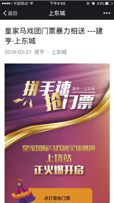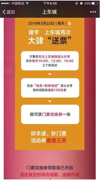 關注【上東城】官微,并在每天的10:00、12:00、15:00整點時刻發(fā)送“姓名+電話”至公眾號,各時間段前100名幸運者即可獲得門票兌換券一張;