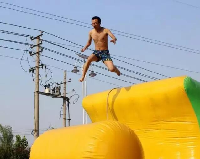 選手爬上2.5米高的充氣臺,從充氣臺跳到考驗原地滾動的直徑為1.2米的充氣柱上,從充氣柱上迅速跳刀連接氣墊上??简炦x手的膽量和靈活度。