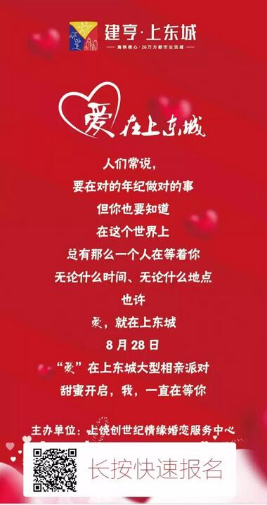 單身的你,一個(gè)人吃,一個(gè)人睡,一個(gè)人工作,一個(gè)人上網(wǎng),一個(gè)人......不想一個(gè)人,就去參加上東城相親大會(huì)吧,和心儀的異性來(lái)個(gè)面對(duì)面的交流,讓你全方位了解心儀的TA,讓你的情感投入充滿機(jī)會(huì),把單身朋友聚集在一起,讓大家能把自己最真實(shí)的一面展現(xiàn)給對(duì)方,成功牽手將有機(jī)會(huì)獲得港澳雙人甜蜜游哦!